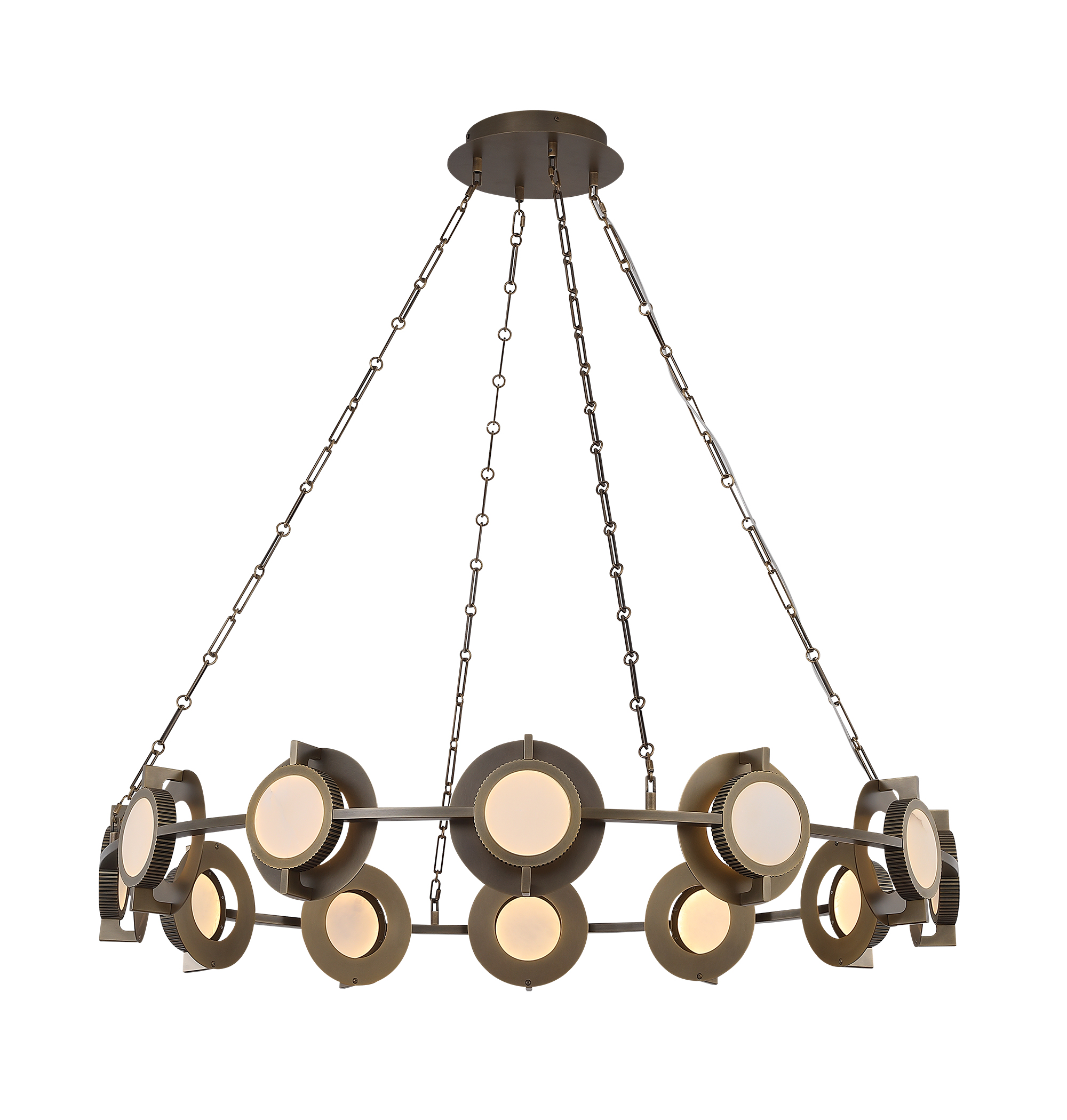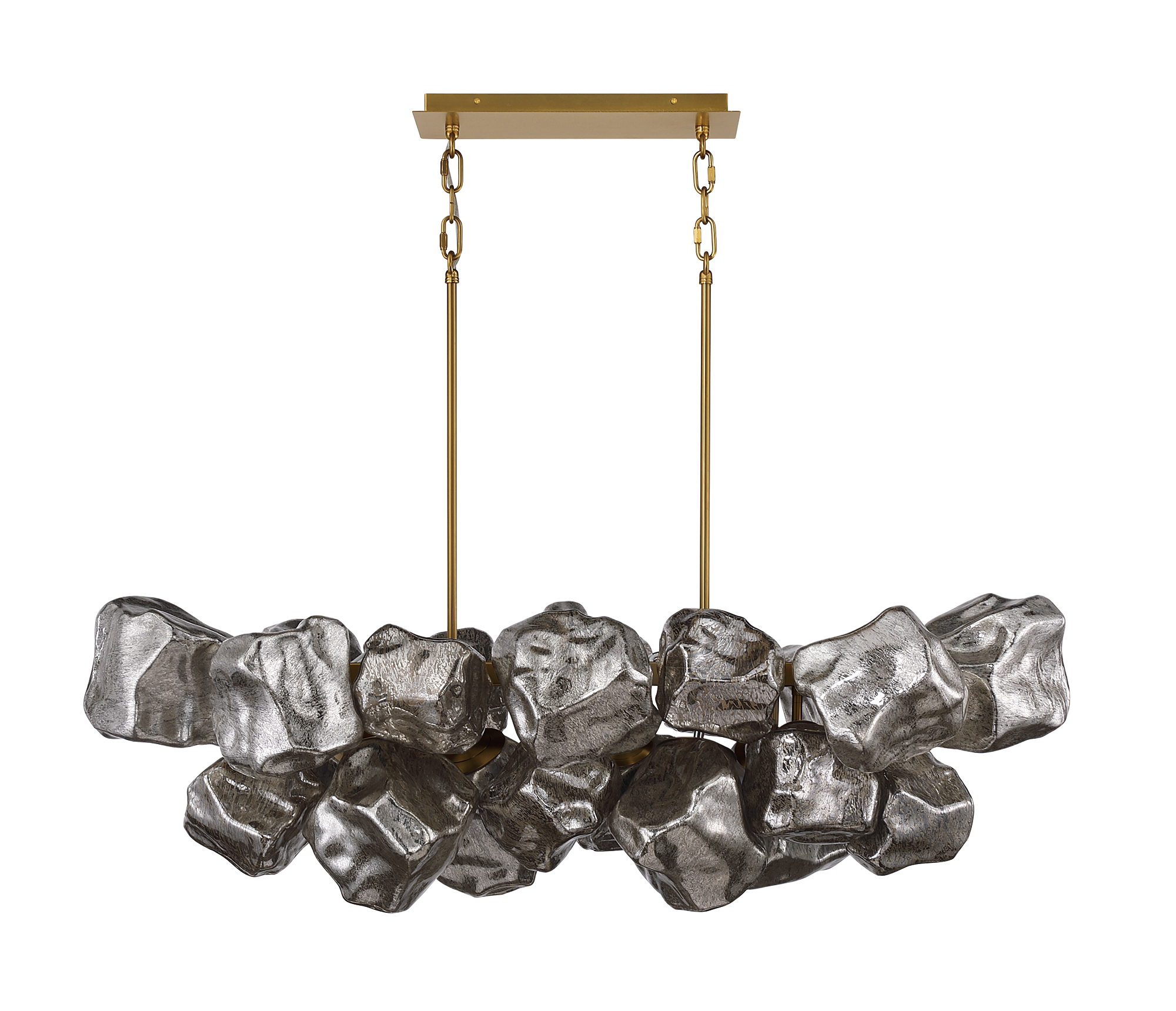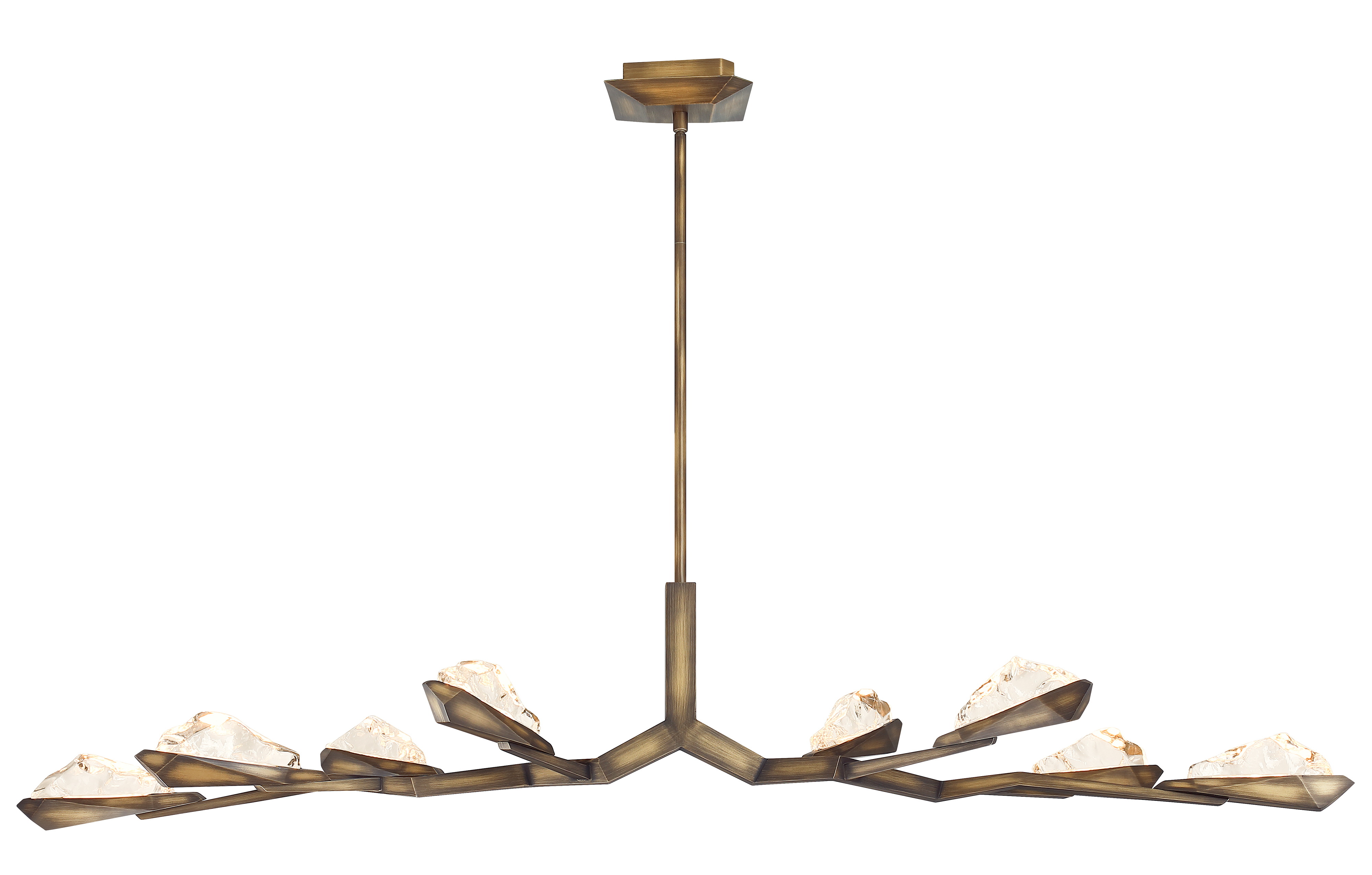 As one of our most popular custom fixtures, this new addition to our Palisades Collection features three Antique Brass sputnik chandeliers, staggered carefully to create unparalleled drama.